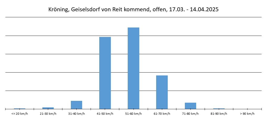 | Kröning, Geiselsdorf von Reit kommend | offen | 17.03.-14.04.2025 | 12417 | 50 km/h | 62 km/h | 59,60 % |